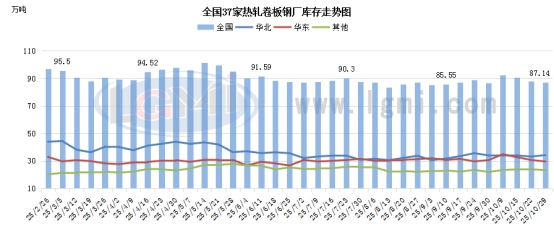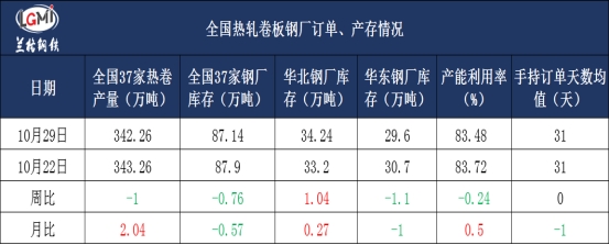 截止10月29日,兰格钢铁网监测的全国热卷钢厂主要指标显示,国内热卷总产量库存钢厂库存量维持在下降趋势,从消息面来看,近期国内市场宏观利好因素发酵,带动资源流通性明显好转,各地库存水平呈现下降趋势。追踪国内37家热卷企业本周热卷总产量约342.26万吨,环比上周同期减少1万吨;热卷轧线产能利用率83.48%,环比上周下浮0.24个百分点;样本钢厂库存量约为87.14万吨,环比上周下降0.76万吨。 目前手持订单情况总体表现为良,长协订单31天,环比上周基本持平:一线企业手持订单天数保持在30天左右,二线企业基本保持在15-25天。(指标评价-良)。 注:评价指标,仅代表兰格根据关联指标给出的市场晴雨表推荐参考,分优、良、一般、低,四个档位。