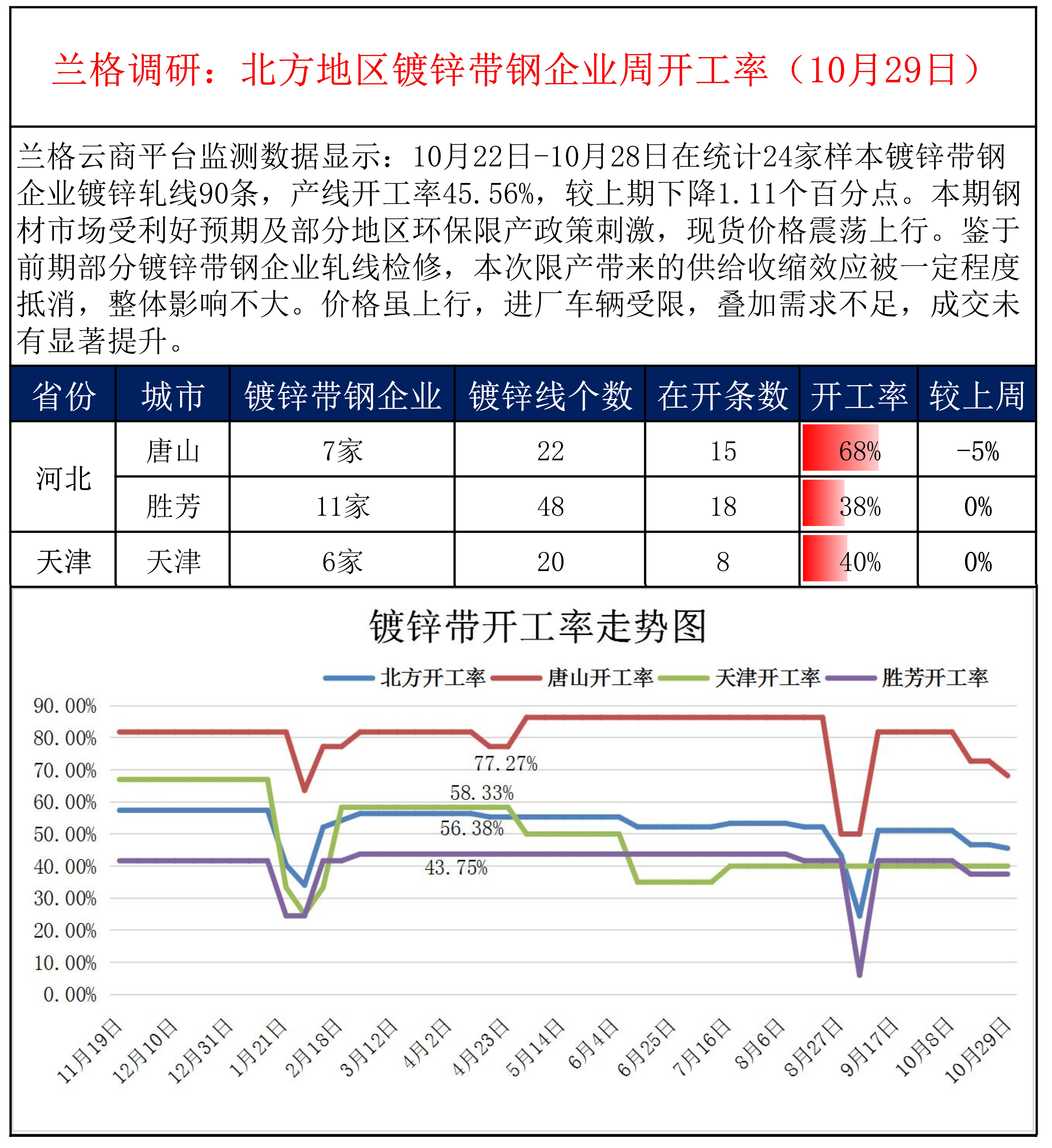 • 兰格调研:北方地区镀锌带钢企业周开工率(10月29日)