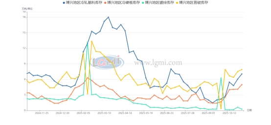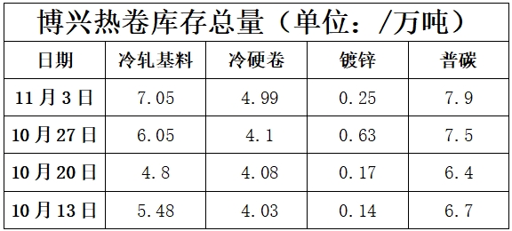 据兰格云商平台监测数据显示,截止11月3日博兴各仓库冷轧基料库存约为7.05万吨,较上期增加1.00万吨;冷硬卷库存4.99万吨,较上期增加0.89万吨。
