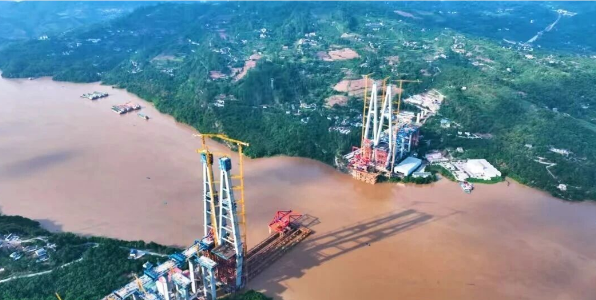 石沱长江大桥位于重庆市涪陵区,是渝万高铁全线控制性工程,主桥全长1056米,主跨608米,是首次采用公铁合建双联塔、公铁同层分幅主梁的桥梁。其6号主塔高253米,是世界最高双联主塔。