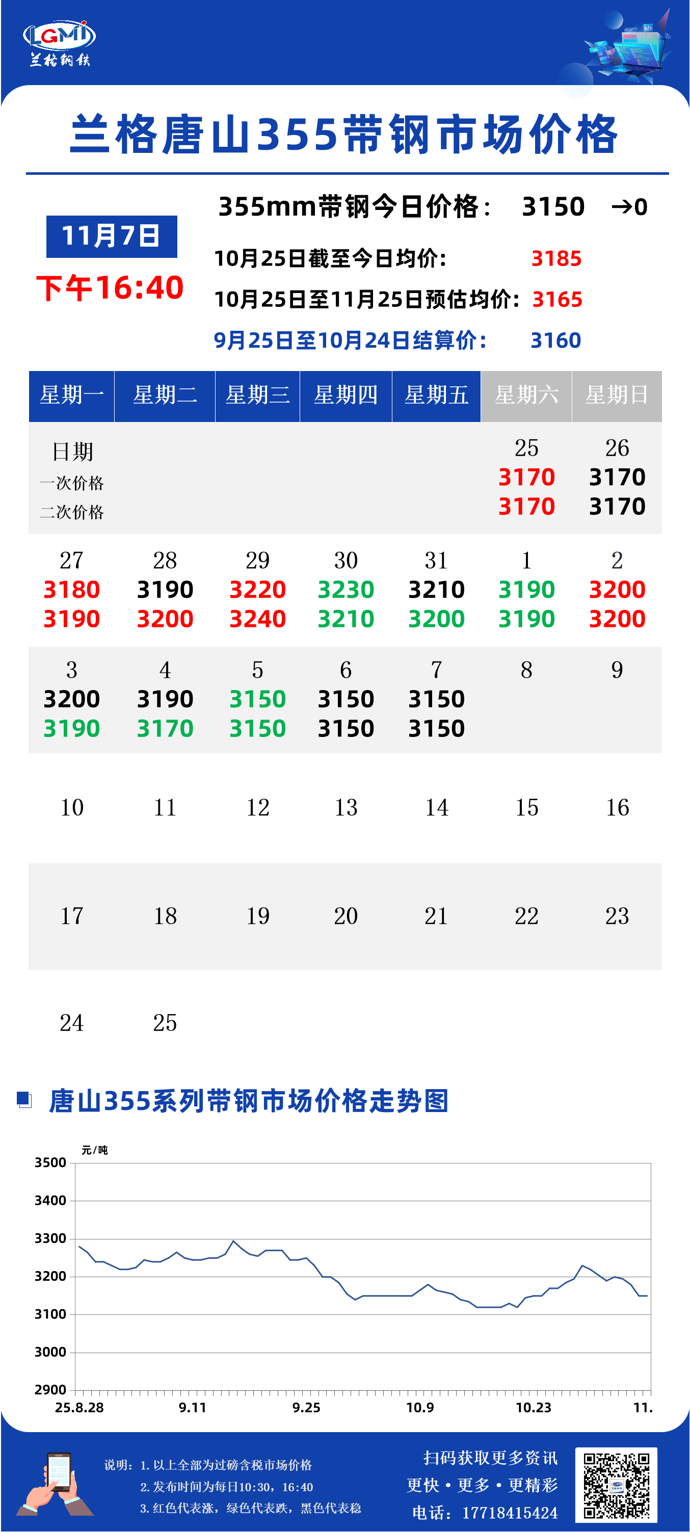 据兰格钢铁云商平台监测数据显示,截至11月7日16:40,唐山地区355系列带钢市场价格为3150元,较早盘价格稳,较昨日市场收盘价格稳。