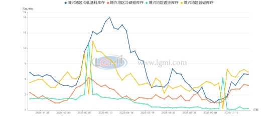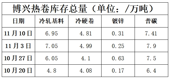 据兰格云商平台监测数据显示,截止11月10日博兴各仓库冷轧基料库存约为6.95万吨,较上期减少0.10万吨;冷硬卷库存4.81万吨,较上期减少0.18万吨。