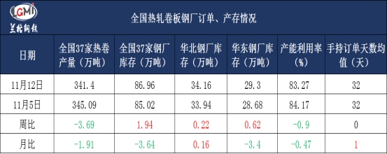截止11月12日,兰格钢铁网监测的全国热卷钢厂主要指标显示,国内热卷总产量阶段性缩减,库存水平环比呈现增量趋势,从近期国内市场走势来看,多空因素博弈趋势加剧,热卷产品利润处于明显收窄的态势,部分热卷钢厂受限于原材料价格高位运行,以及终端需求疲软的双重压力,热卷利润已逼近成本线,后期或逐步调整生产节奏,主动降低产能利用率以规避市场风险。追踪国内37家热卷企业本周热卷总产量约341.4万吨,环比上周同期减少3.69万吨;热卷轧线产能利用率83.27%,环比上周下浮0.9个百分点;样本钢厂库存量约为86.96万吨,环比上周增加1.94万吨。 目前手持订单情况总体表现为良,长协订单32天,环比上周基本持平:一线企业手持订单天数保持在30天左右,二线企业基本保持在15-25天。(指标评价-良)。 注:评价指标,仅代表兰格根据关联指标给出的市场晴雨表推荐参考,分优、良、一般、低,四个档位。