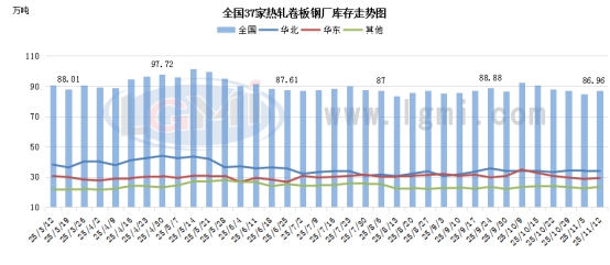 据兰格钢铁网统计,本周全国热卷样本钢厂库存量86.96万吨,环比减少3.69万吨,从数据来看,从数据可见,当前库存水平的环比变化与总产量的缩减形成一定联动,在总产量减少的背景下,库存却呈现增加态势,这进一步反映出当前市场供需关系的微妙变化,尤其是终端需求未能及时消化现有供应量,使得各地钢厂库存出现累积现象。