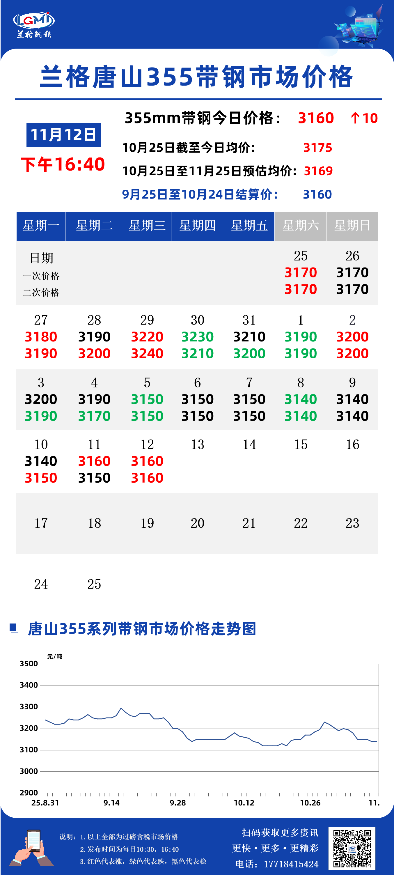 据兰格钢铁云商平台监测数据显示,截至11月12日16:40,唐山地区355系列带钢市场价格为3160元,较早盘价格稳,较昨日市场收盘价格涨10元。