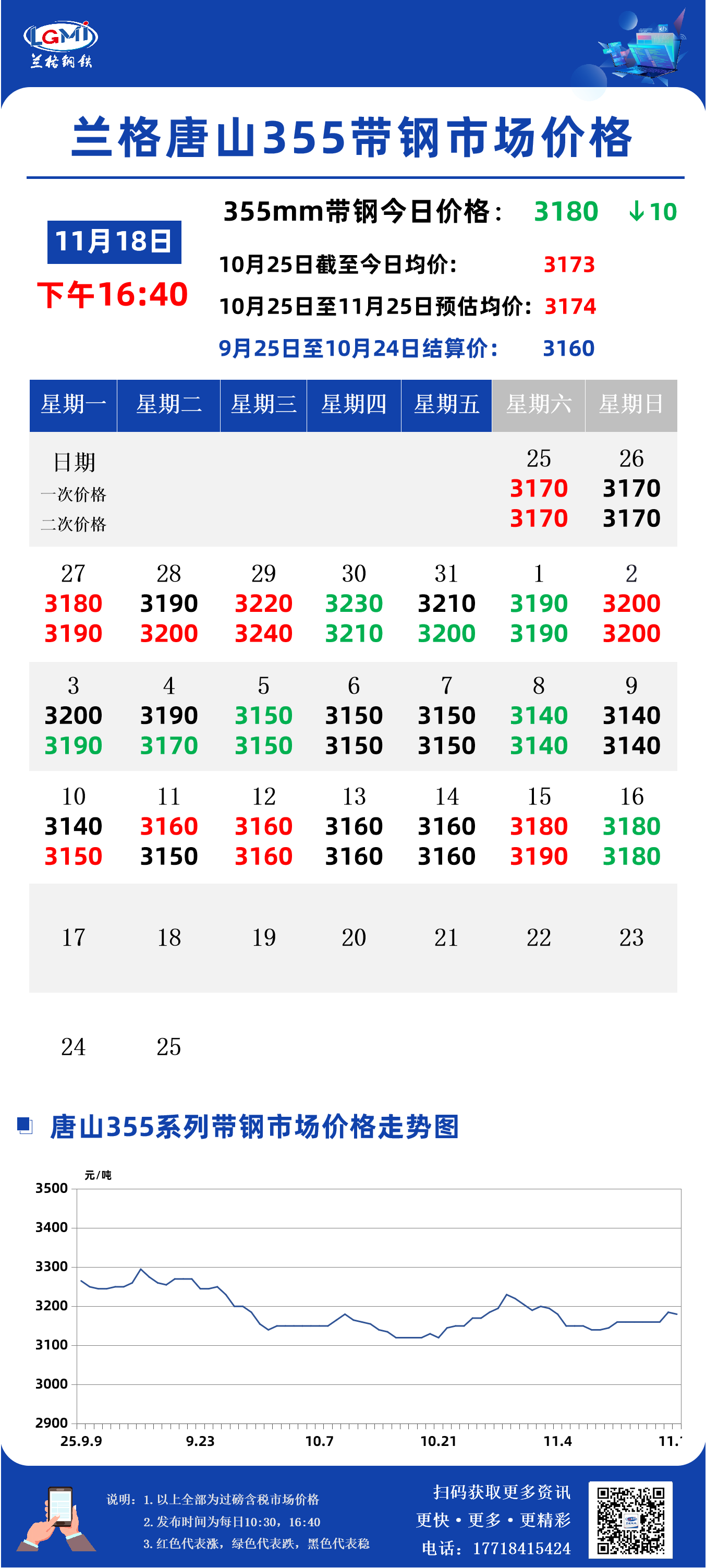 据兰格钢铁云商平台监测数据显示,截至11月18日16:40,唐山地区355系列带钢市场价格为3180元,较早盘价格稳,较昨日市场收盘价格跌10元。