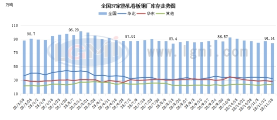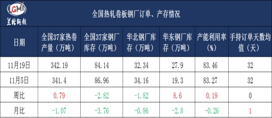 截止11月19日,兰格钢铁网监测的全国热卷钢厂主要指标显示,国内热卷总产量呈现窄幅增长的趋势,但库存水平相比上周同期明显下降,主要是因近期期货方面多头资金发力,带动部分商家释放拿货情绪,各地供求压力有所缓解。 追踪国内37家热卷企业本周热卷总产量约342.19万吨,环比上周同期增加0.79万吨;热卷轧线产能利用率83.46%,环比上周上升0.19个百分点;样本钢厂库存量约为84.14万吨,环比上周下降2.82万吨。 目前手持订单情况总体表现为良,长协订单32天,环比上周基本持平:一线企业手持订单天数保持在30天左右,二线企业基本保持在15-25天。(指标评价-良)。 注:评价指标,仅代表兰格根据关联指标给出的市场晴雨表推荐参考,分优、良、一般、低,四个档位。