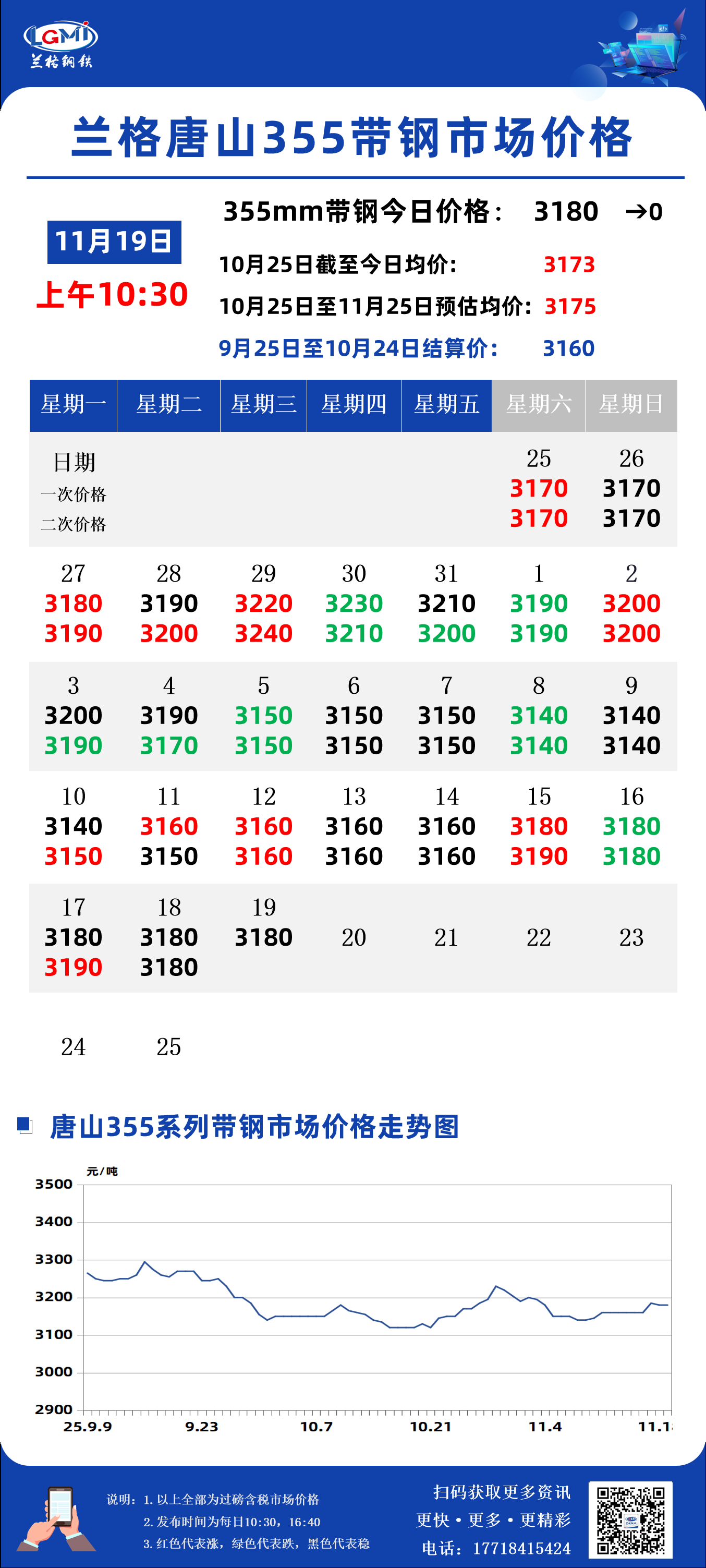 据兰格钢铁云商平台监测数据显示,截至11月19日10:30,唐山地区355系列带钢市场价格为3180元,较昨日市场收盘价格稳。