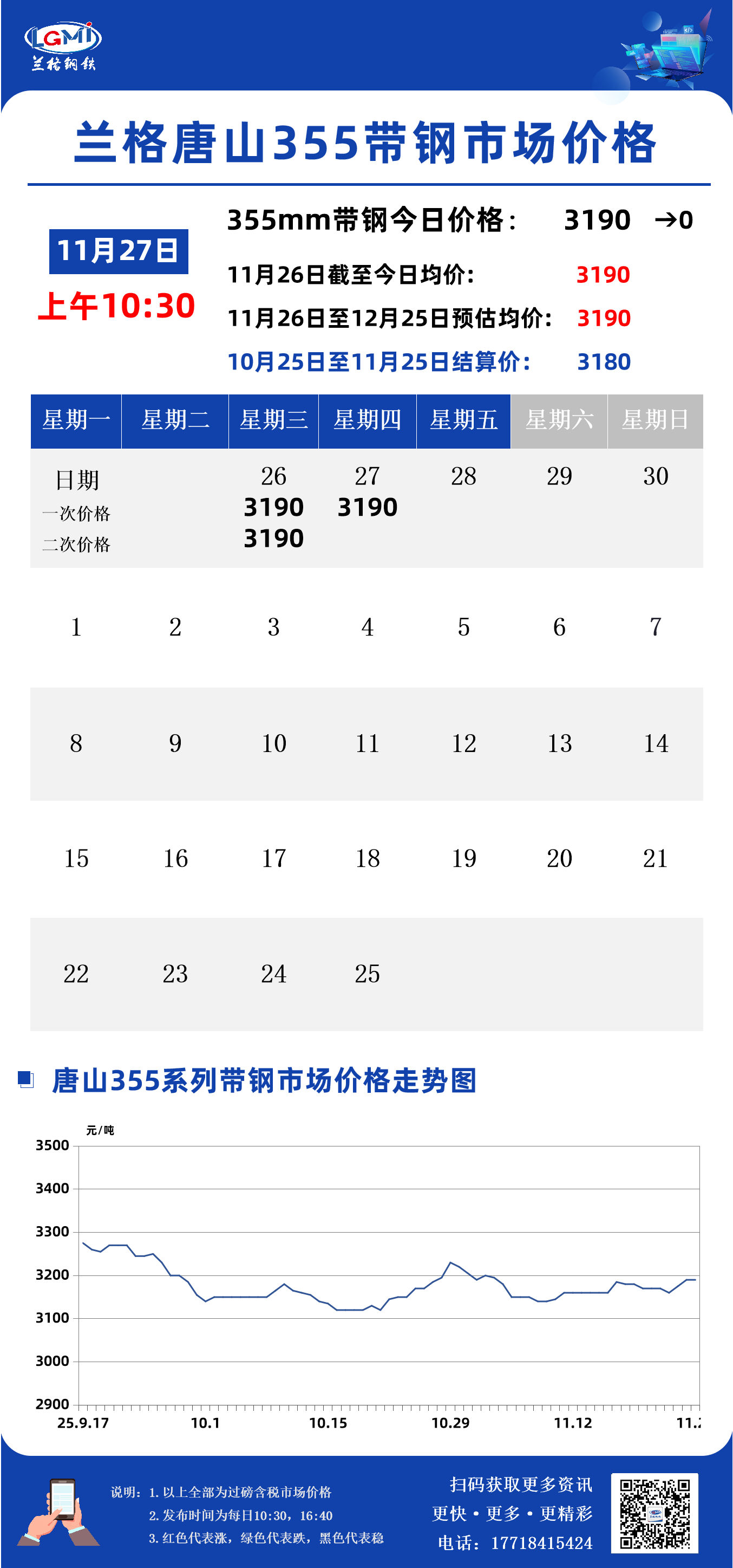 据兰格钢铁云商平台监测数据显示,截至11月27日10:30,唐山地区355系列带钢市场价格为3190元,较昨日市场收盘价格稳。
