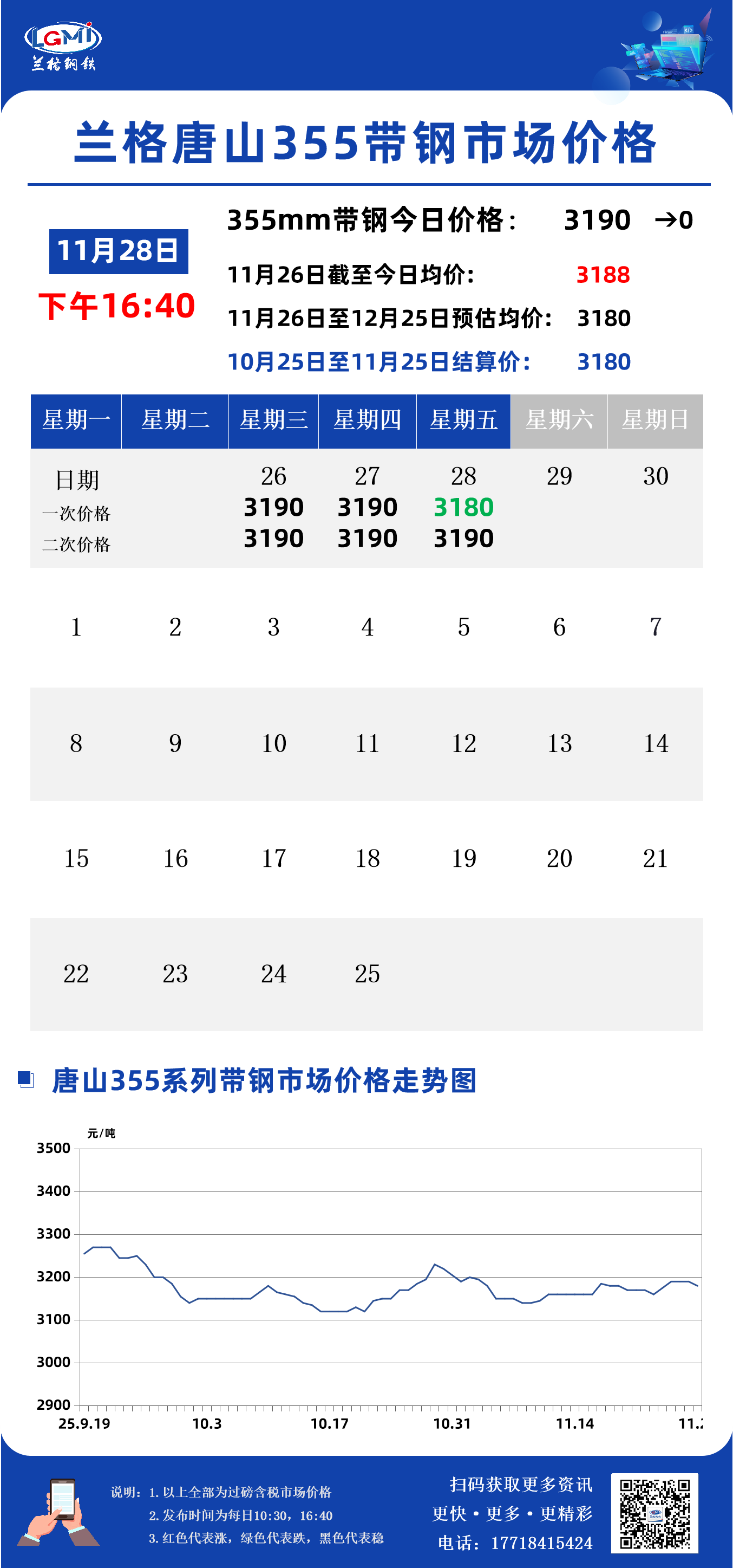 据兰格钢铁云商平台监测数据显示,截至11月28日16:40,唐山地区355系列带钢市场价格为3190元,较昨日市场收盘价格稳。