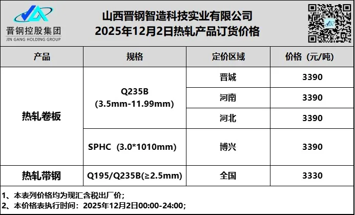 • 12月2日山西晋钢热轧卷板订货价格