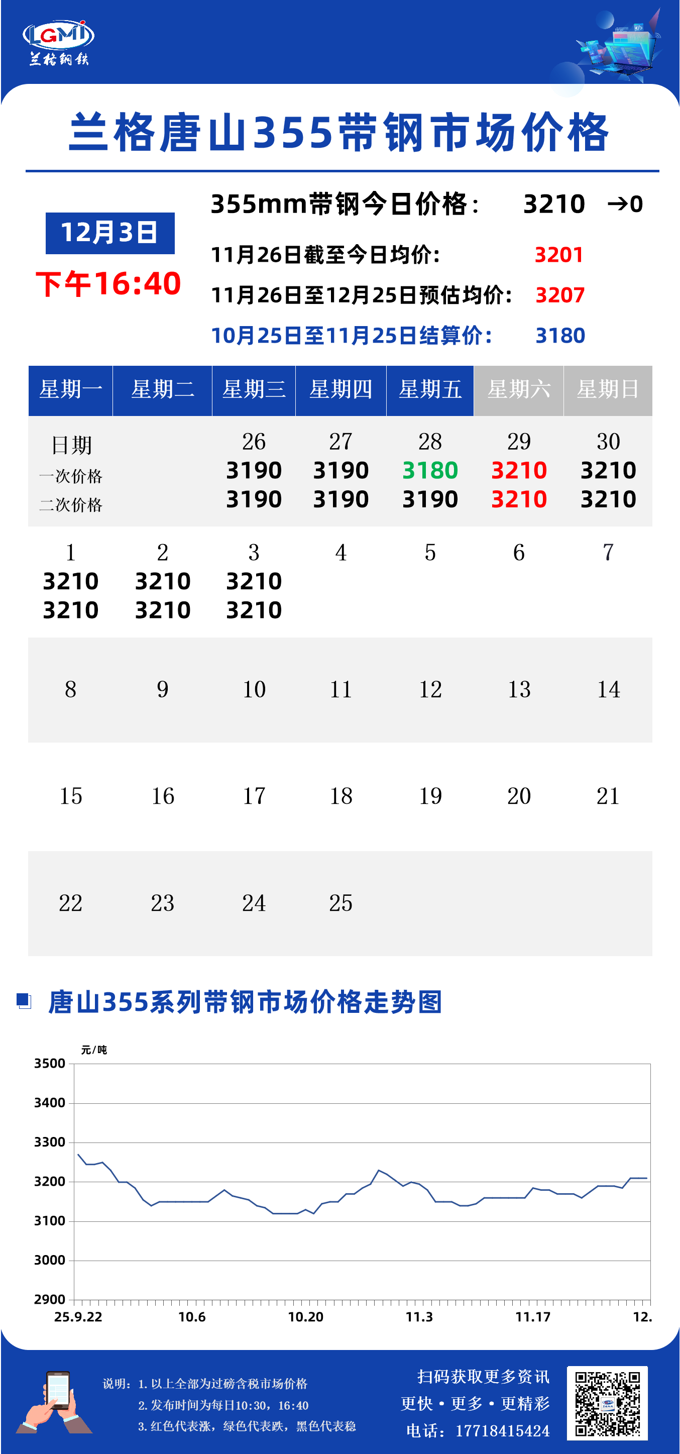 据兰格钢铁云商平台监测数据显示,截至12月3日16:40,唐山地区355系列带钢市场价格为3210元,较昨日市场收盘价格稳。