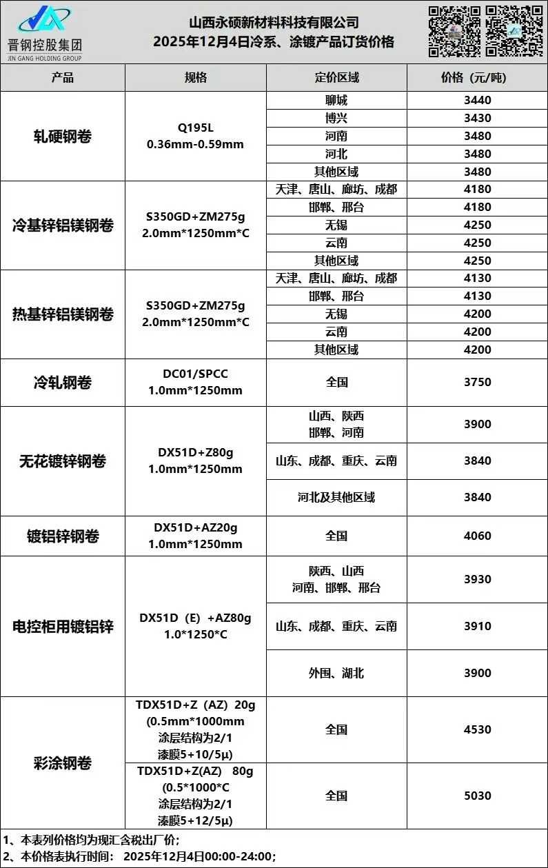 • 12月4日山西晋钢冷系 涂镀订货价格