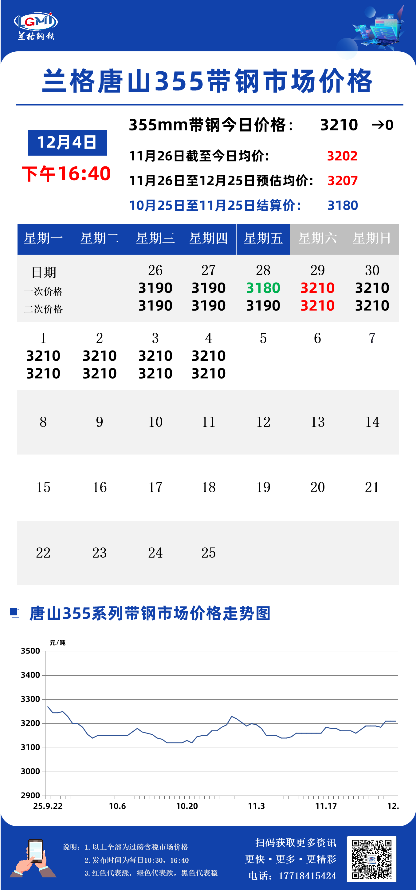 据兰格钢铁云商平台监测数据显示,截至12月4日16:40,唐山地区355系列带钢市场价格为3210元,较昨日市场收盘价格稳。