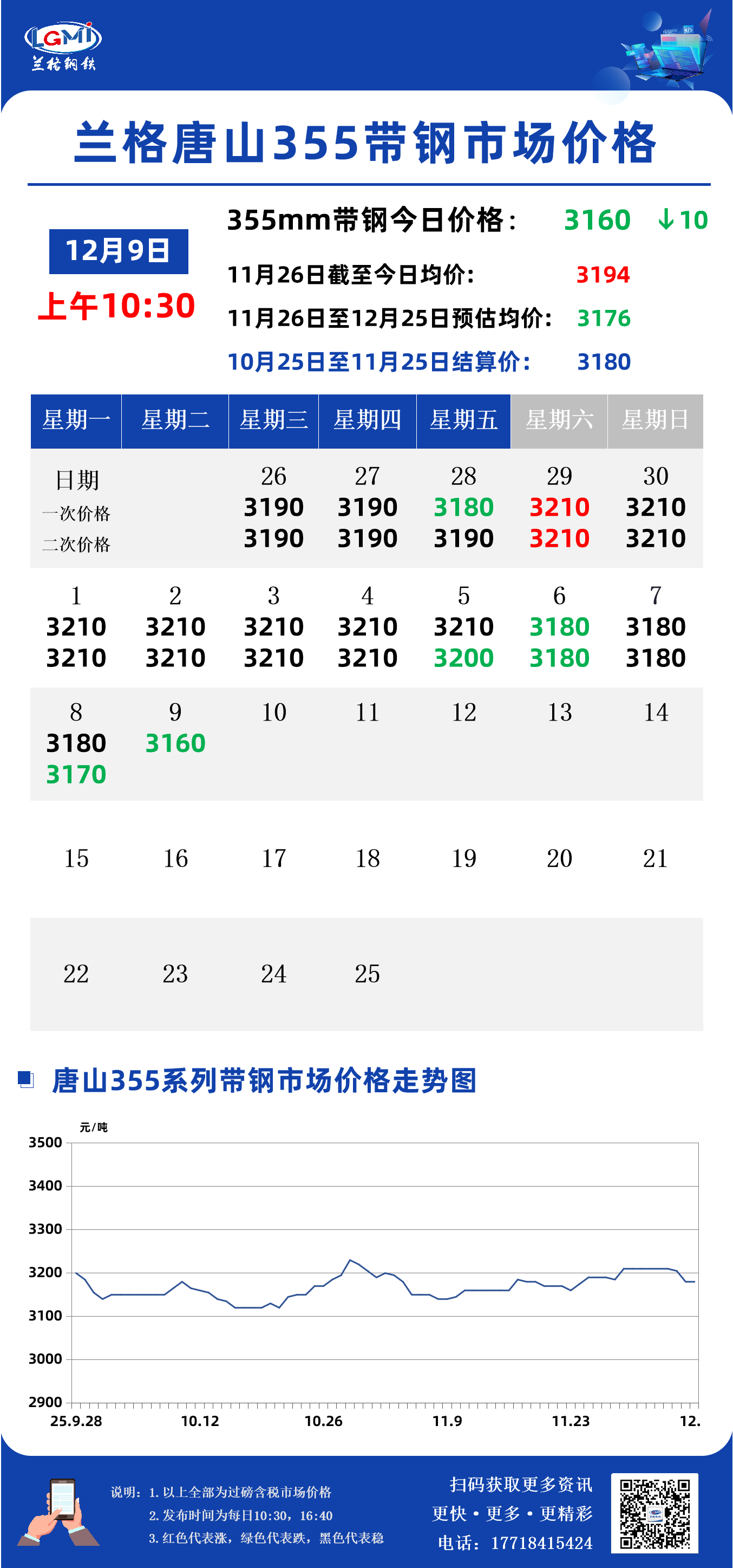 据兰格钢铁云商平台监测数据显示,截至12月9日10:30,唐山地区355系列带钢市场价格为3160元,较昨日市场收盘价格跌10元。