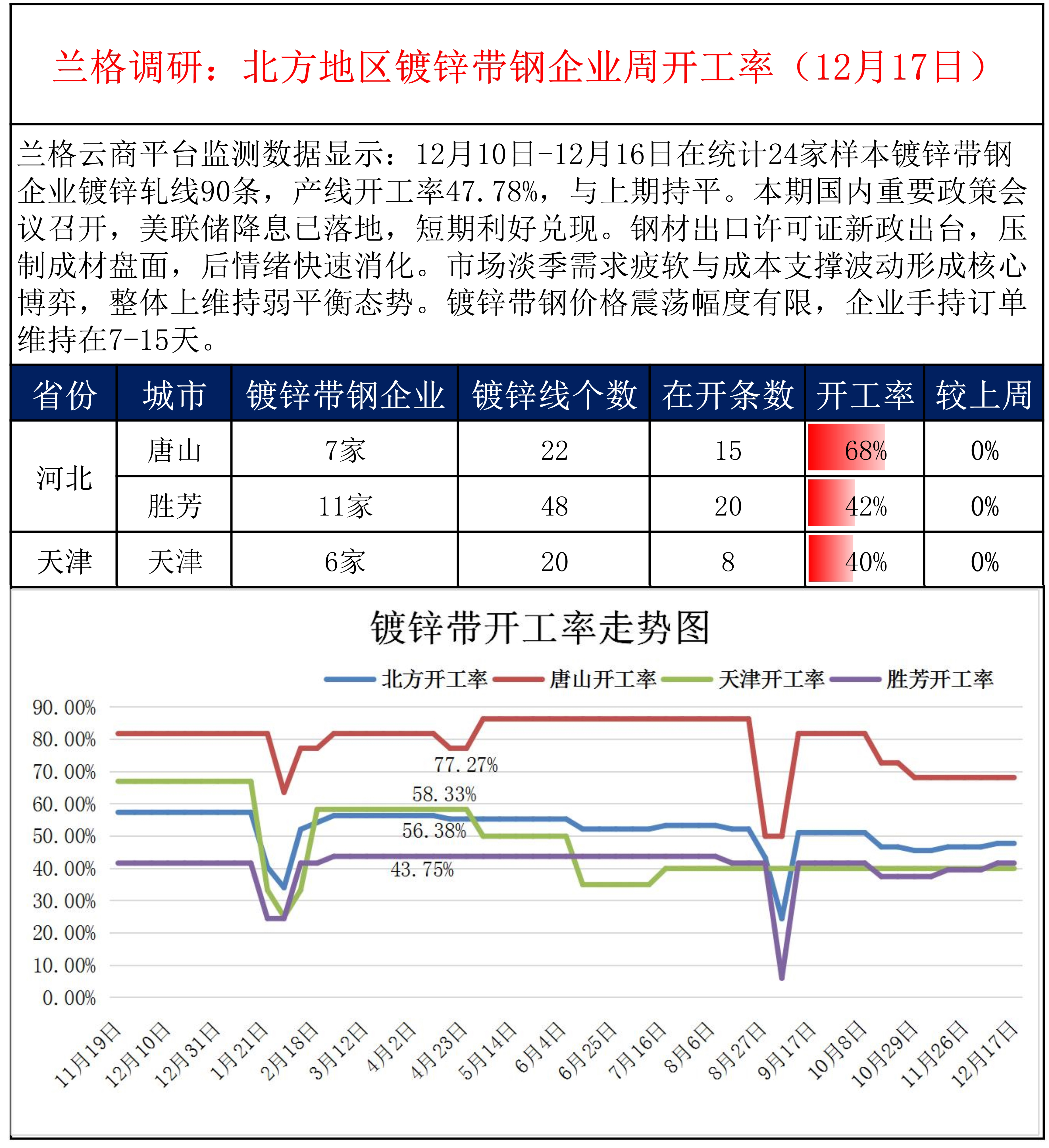 • 兰格调研:北方地区镀锌带钢企业周开工率(12月17日)