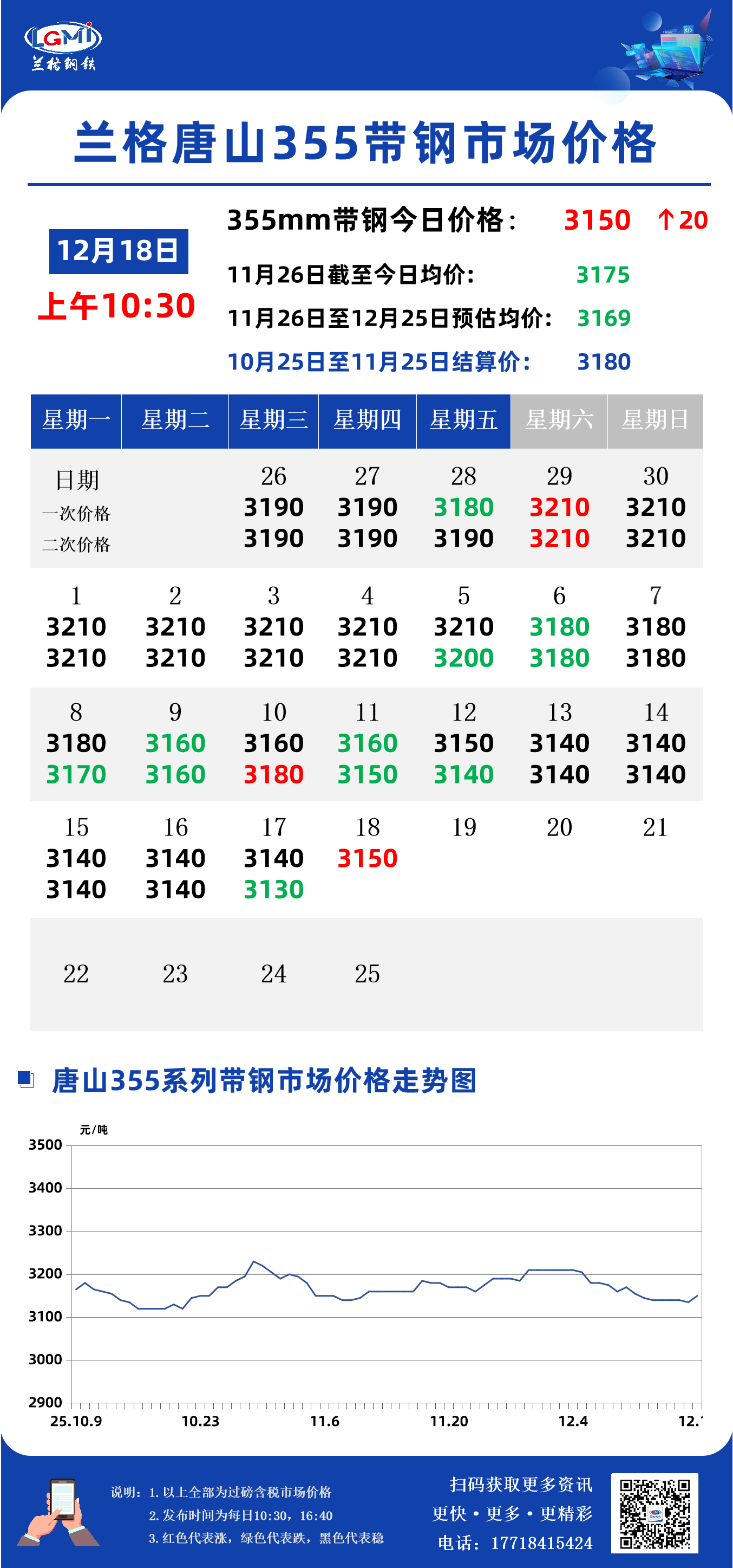 据兰格钢铁云商平台监测数据显示,截至12月18日10:30,唐山地区355系列带钢市场价格为3150元,较昨日市场收盘价格涨20元。