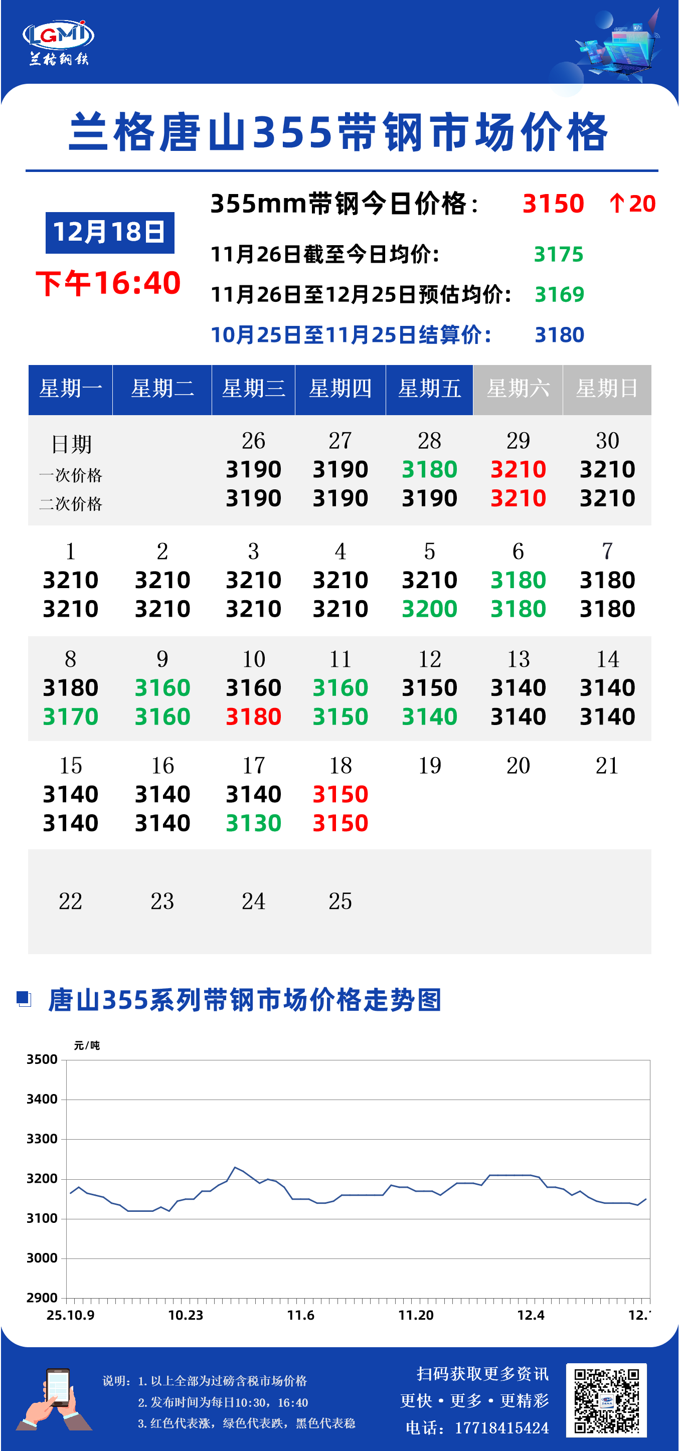 据兰格钢铁云商平台监测数据显示,截至12月18日16:40,唐山地区355系列带钢市场价格为3150元,较昨日市场收盘价格涨20元。