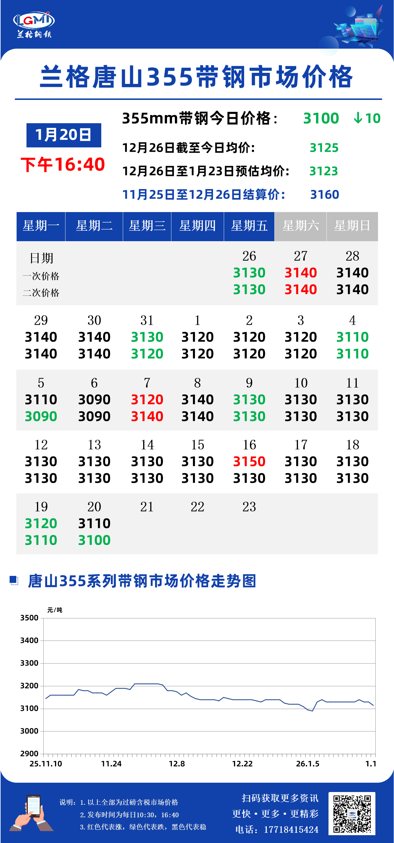 兰格钢铁云商平台监测数据显示,截至1月20日16:40,唐山地区355系列带钢市场价格为3100元,较昨日市场收盘价格下跌10元。