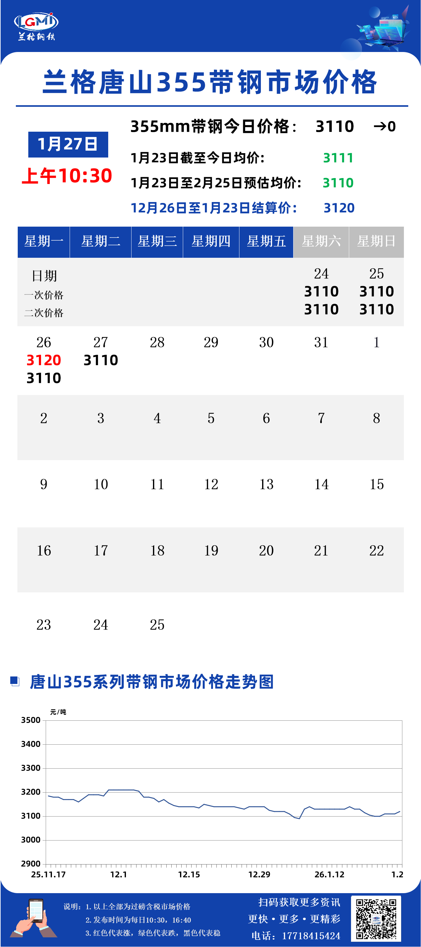 据兰格钢铁云商平台监测数据显示,截至1月27日10:30,唐山地区355系列带钢市场价格为3110元,较昨日市场收盘价格稳。
