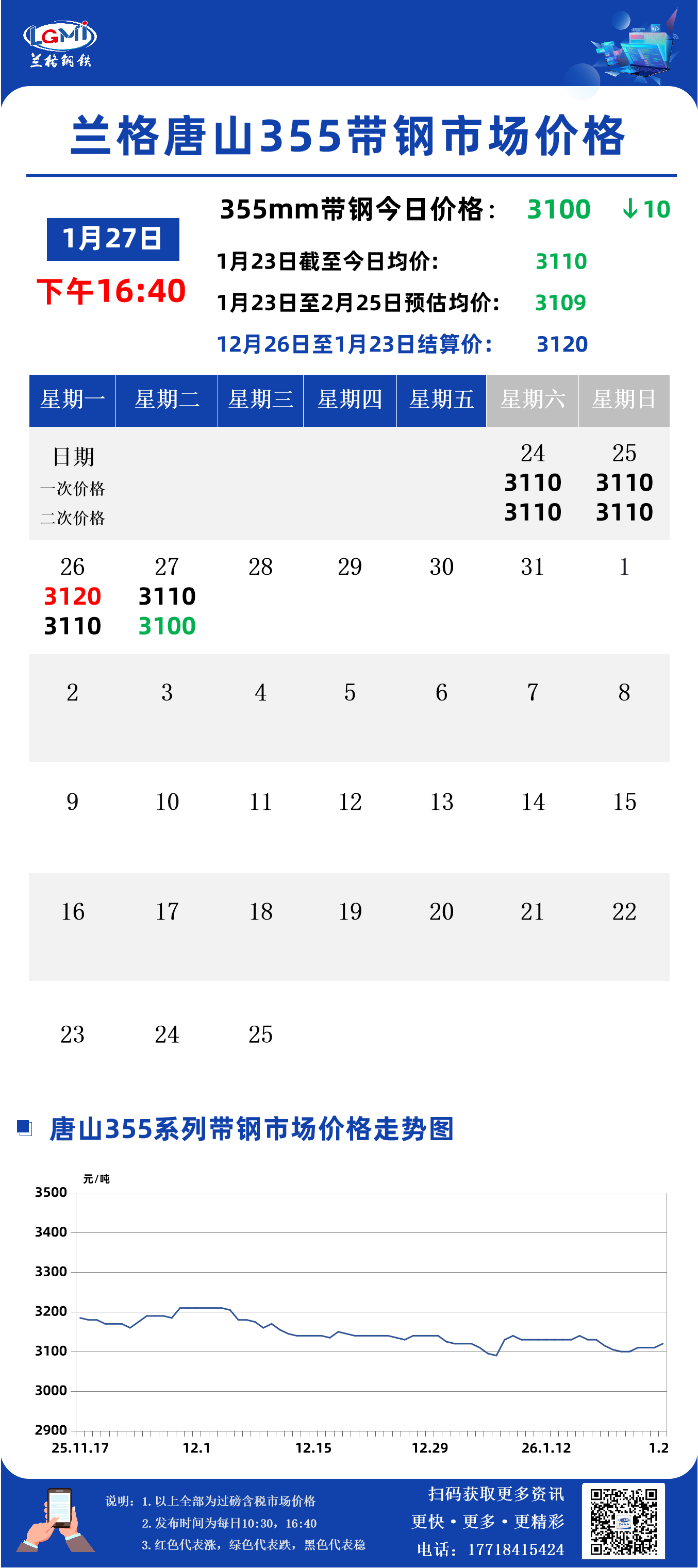 兰格钢铁云商平台监测数据显示,截至1月27日16:40,唐山地区355系列带钢市场价格为3100元,较昨日市场收盘价格跌10元。