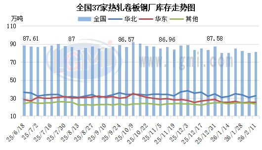 据兰格钢铁网统计,本周全国热卷样本钢厂库存量81.24万吨,较上周增加1.06万吨。本周钢厂热卷产量持续增加,不过随着春节气氛逐渐浓郁,贸易商以及下游业者对于热卷采购积极性有所转弱,钢厂热卷库存量呈现小幅增加的情况。