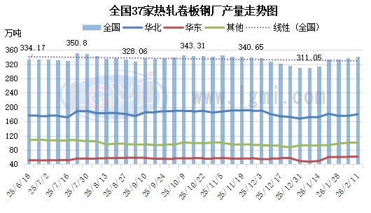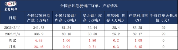 截止2月11日,兰格钢铁网监测的全国热卷钢厂主要指标显示,国内热卷总产量有所增加,钢厂厂内库存小幅累库。追踪国内37家热卷企业本周热卷总产量约341.33万吨,较上周同期增加4.43万吨;热卷轧线产能利用率83.25%,增加1.08个百分点;样本钢厂库存量约为81.24万吨,较上周增加1.06万吨。 目前手持订单情况总体表现为良,长协订单29天,较上周稳定:一线企业手持订单天数保持在30天左右,二线企业基本保持在15-25天。(指标评价-良)。 注:评价指标,仅代表兰格根据关联指标给出的市场晴雨表推荐参考,分优、良、一般、低,四个档位。