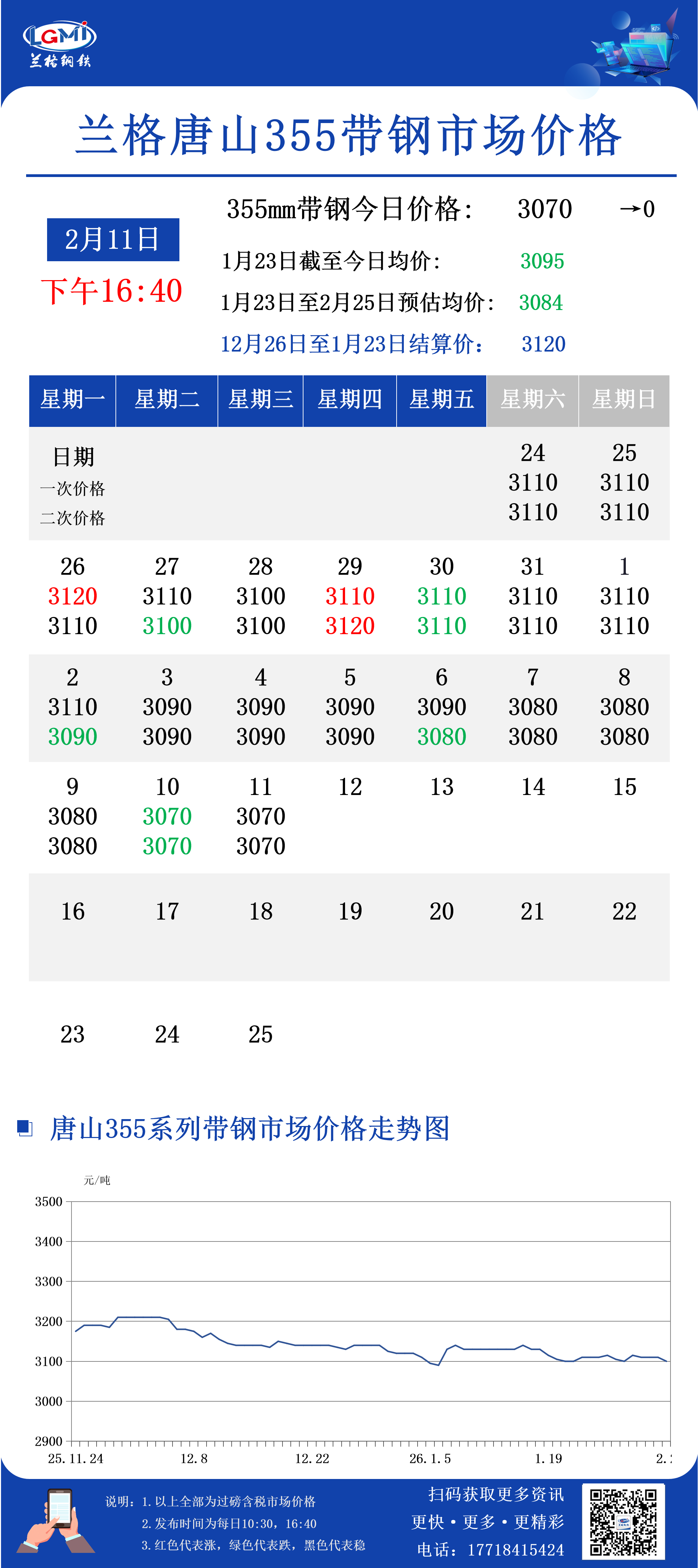 兰格钢铁云商平台监测数据显示,截至2月11日16:40,唐山地区355系列带钢市场价格为3070元,较昨日市场收盘价格稳。