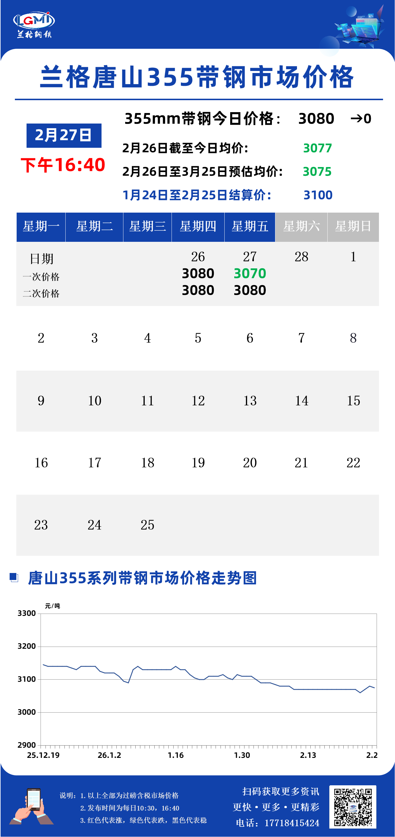 兰格钢铁云商平台监测数据显示,截至2月27日16:40,唐山地区355系列带钢市场价格为3080元,较昨日市场收盘价格稳。