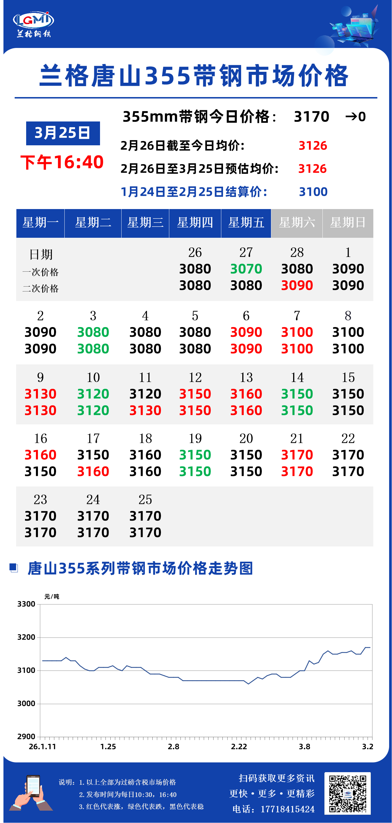 兰格钢铁云商平台监测数据显示,截至3月25日16:40,唐山地区355系列带钢市场价格为3170元,较昨日市场收盘价格稳。