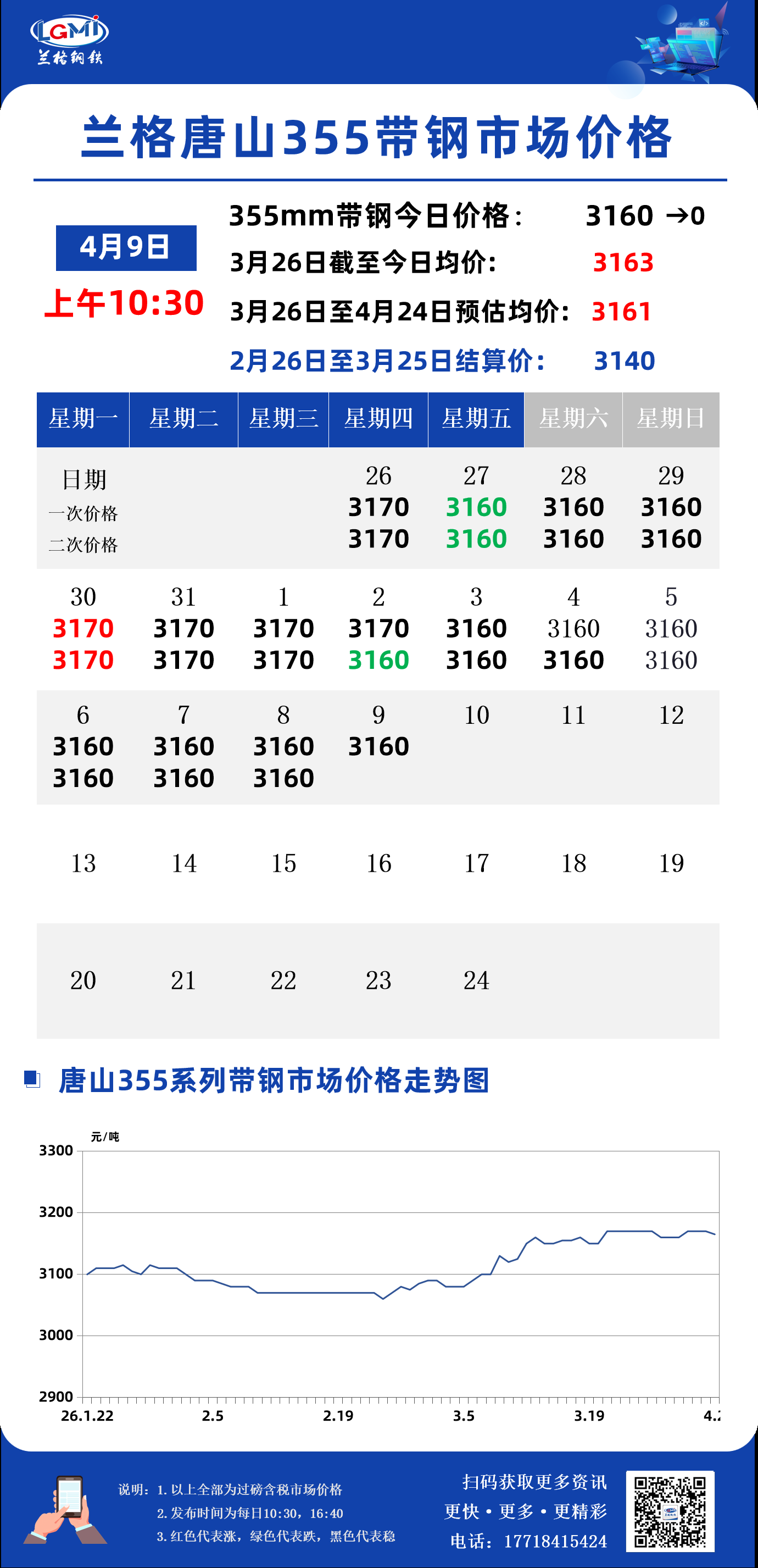 兰格钢铁云商平台监测数据显示,截至4月9日10:30,唐山地区355系列带钢市场价格为3160元,较昨市场收盘价格稳。