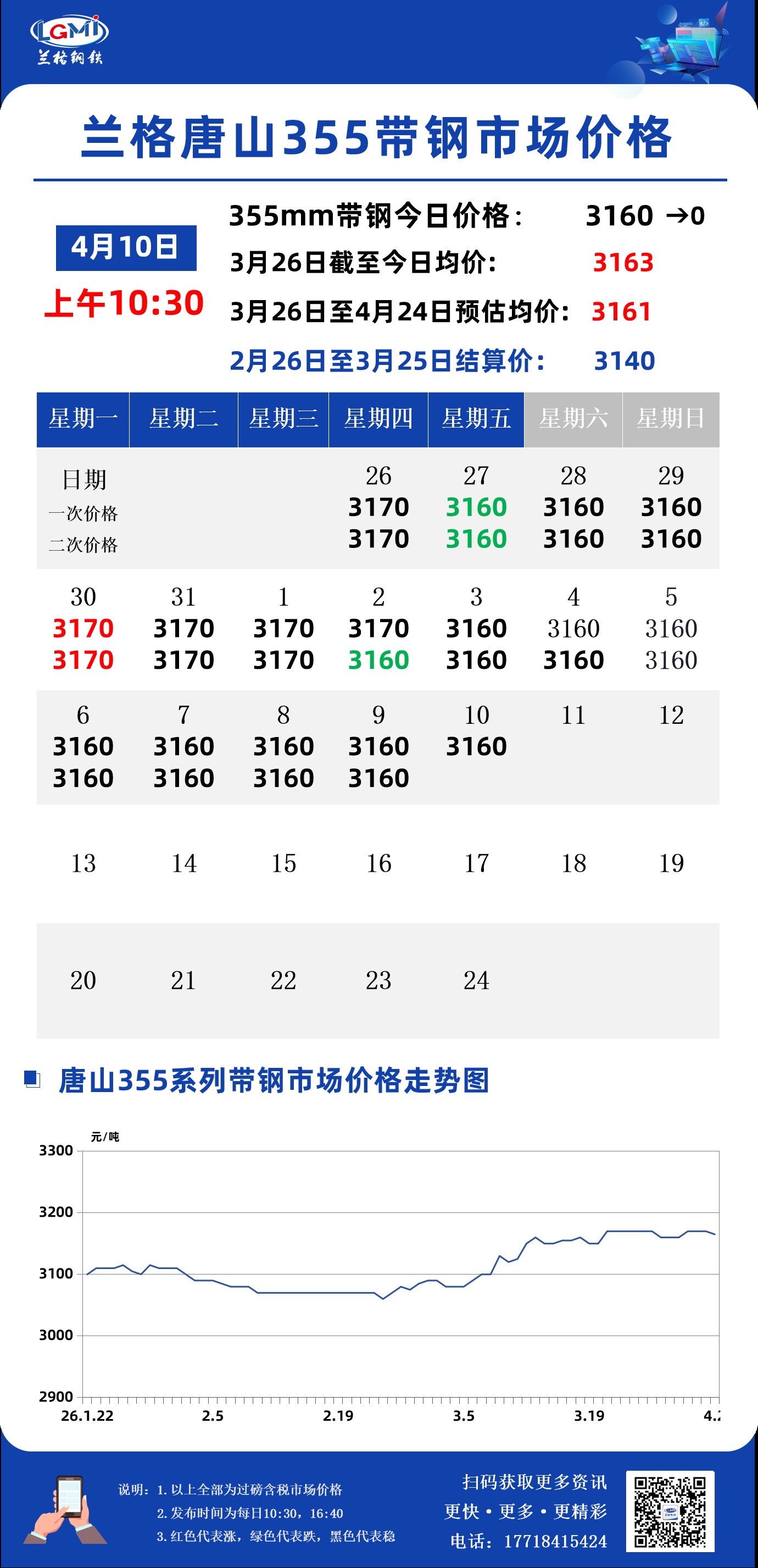兰格钢铁云商平台监测数据显示,截至4月10日10:30,唐山地区355系列带钢市场价格为3160元,较昨市场收盘价格稳。