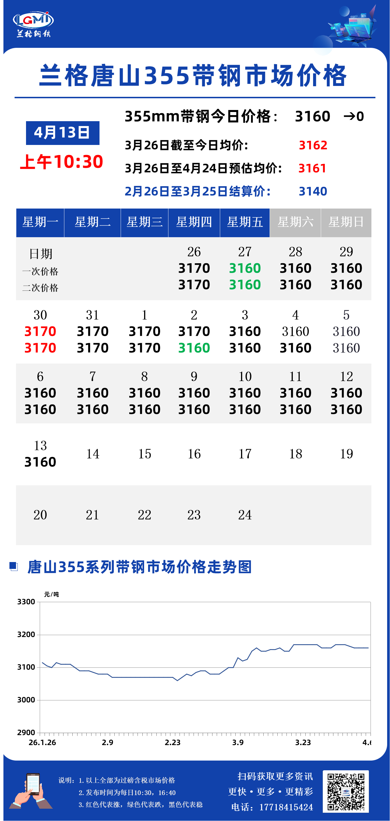 兰格钢铁云商平台监测数据显示,截至4月13日10:30,唐山地区355系列带钢市场价格为3160元,较昨市场收盘价格稳。