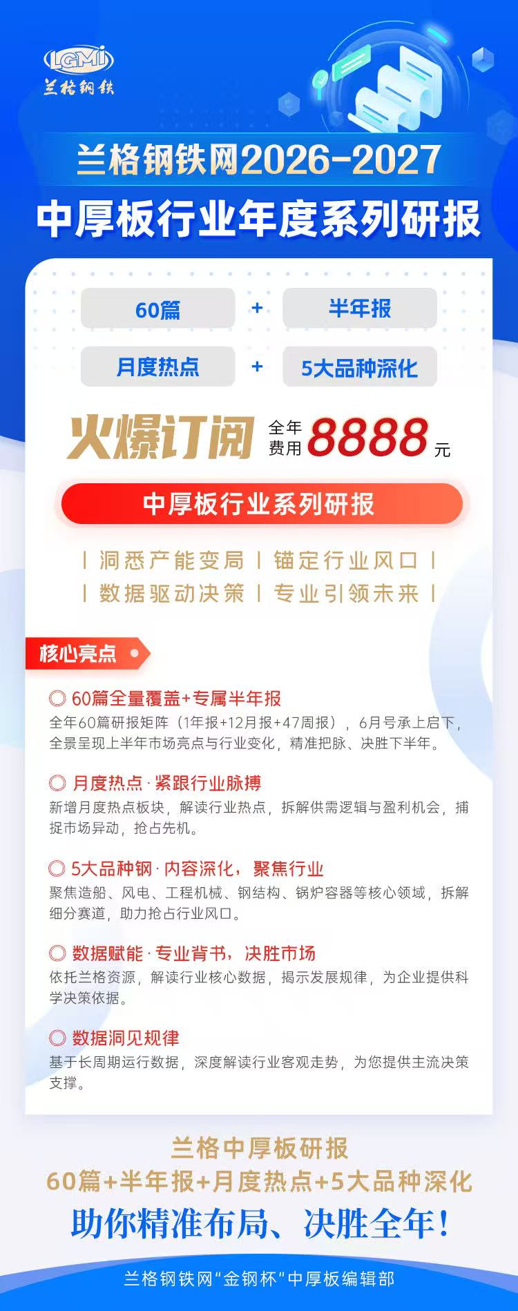2026-2027年,中厚板行业机遇与挑战并存,唯有精准洞察、科学决策,才能行稳致远。兰格钢铁网中厚板年度系列研报,以专业为基、以数据为翼、以实战为要,全年60篇深度内容、月度热点追踪、五大赛道深耕、权威数据支撑,全方位护航企业经营决策。兰格钢铁网中厚板行业年度系列研报火爆订阅中,订阅请咨询路华英15810922394,孙新萍13335200363。
