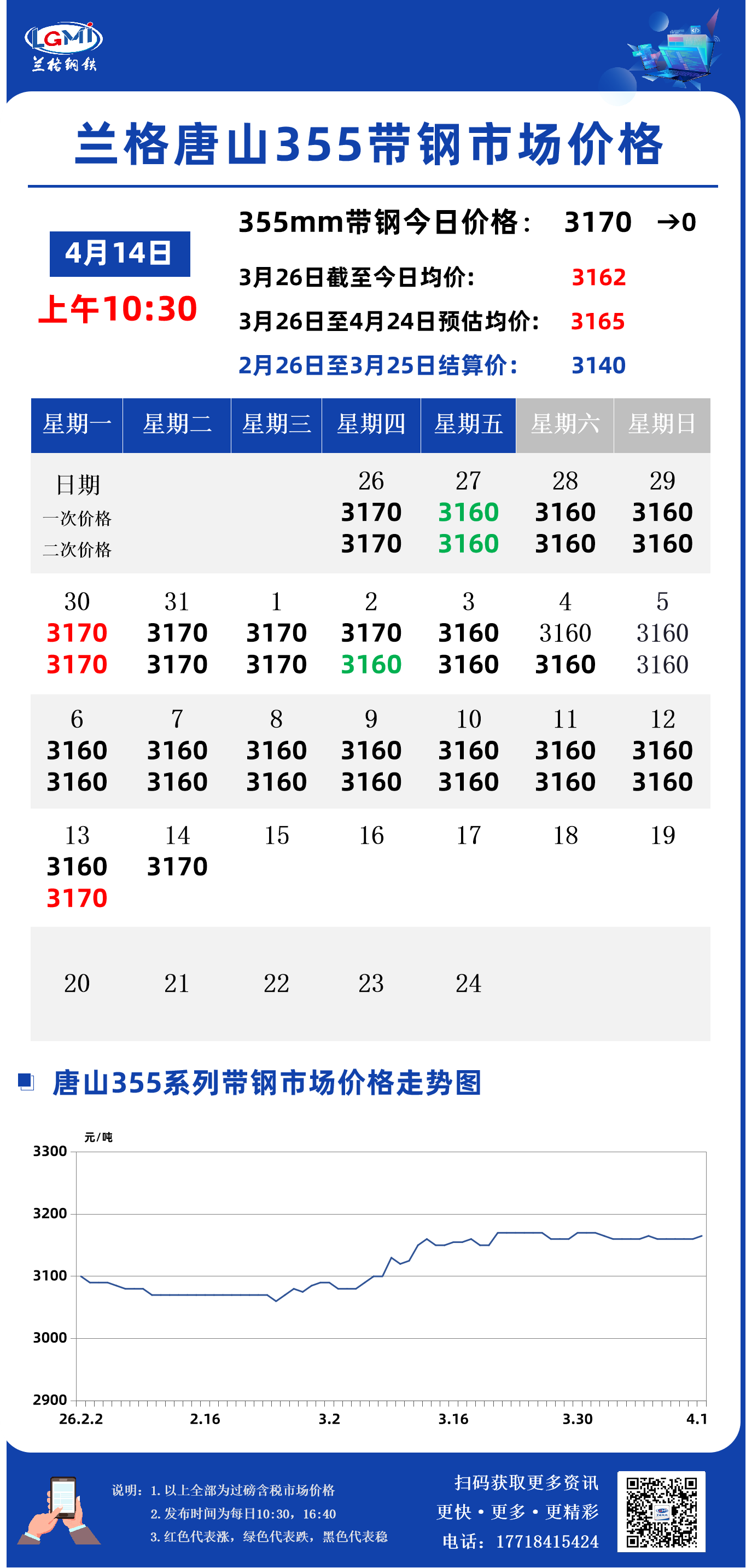 兰格钢铁云商平台监测数据显示,截至4月14日10:30,唐山地区355系列带钢市场价格为3170元,较昨市场收盘价格稳。