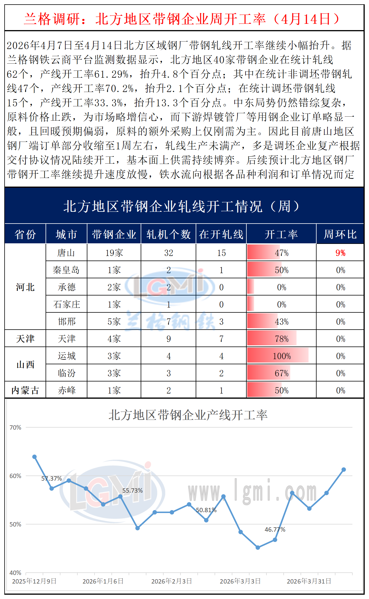 兰格调研:北方地区带钢企业周开工率(4月14日)