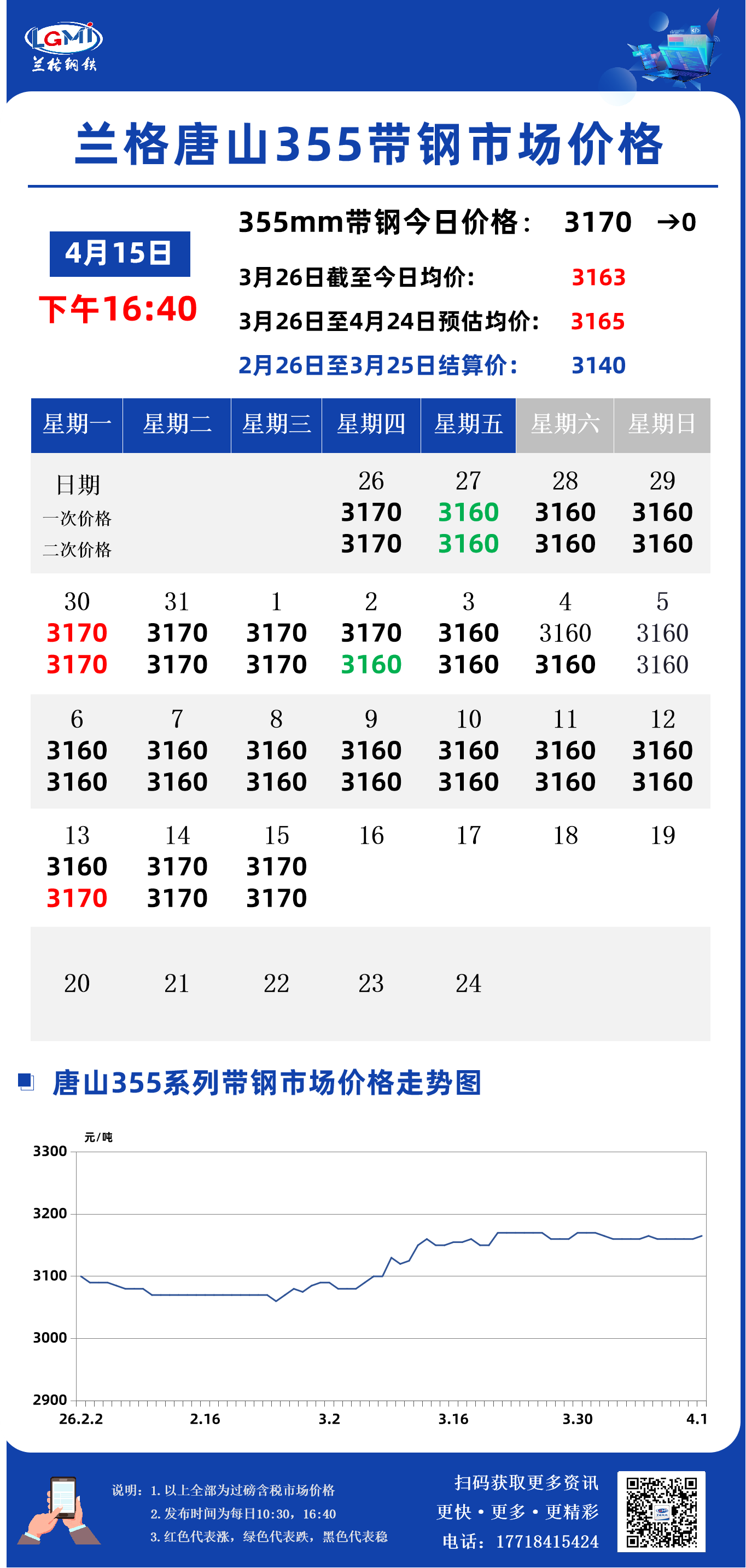 兰格钢铁云商平台监测数据显示,截至4月15日16:40,唐山地区355系列带钢市场价格为3170元,较昨市场收盘价格稳。