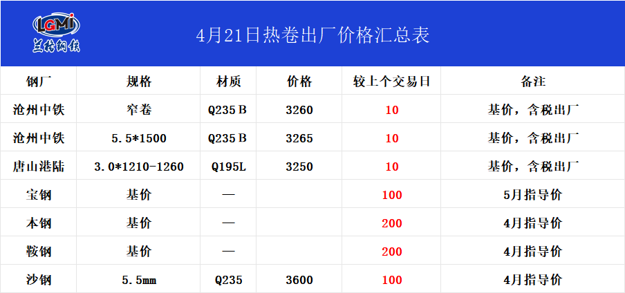 • 4月21日热卷出厂价格汇总