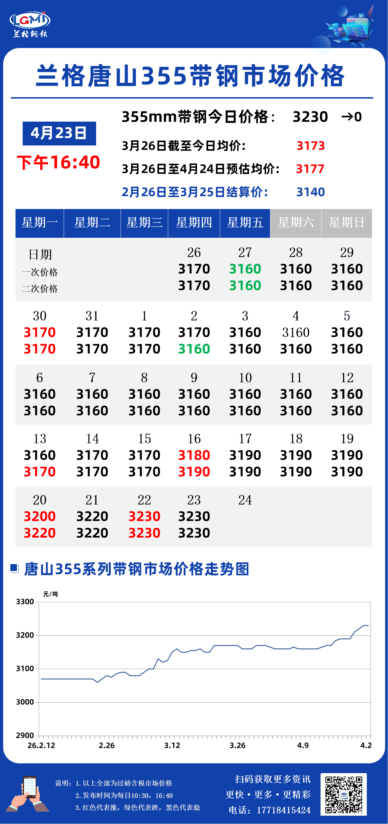 兰格钢铁云商平台监测数据显示,截至4月23日16:40,唐山地区355系列带钢市场价格为3230元,较昨市场收盘价格稳。