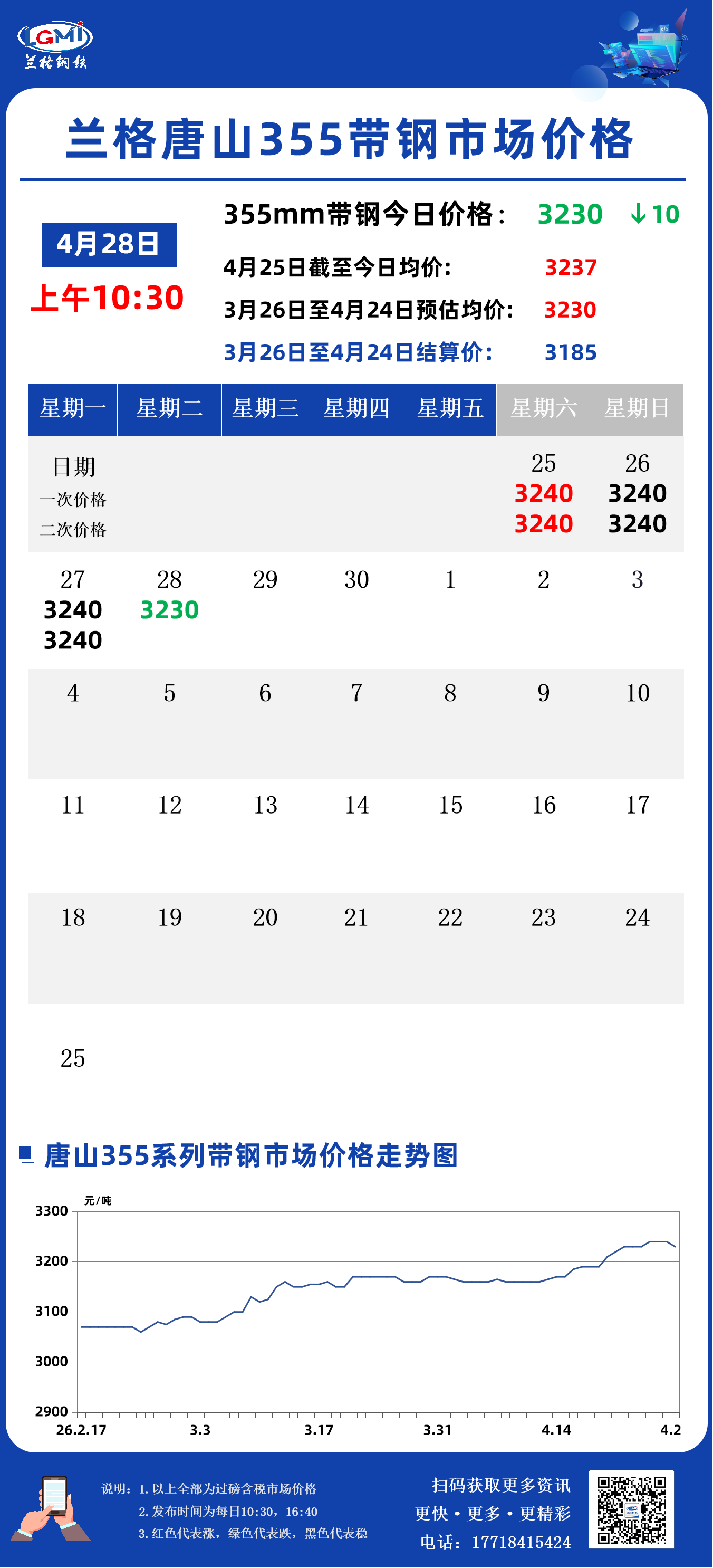 兰格钢铁云商平台监测数据显示,截至4月28日10:30,唐山地区355系列带钢市场价格为3230元,较昨市场收盘价格跌10元。